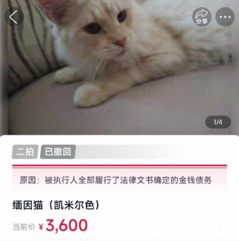 这是该猫第二次上拍,一拍起拍价为4500元,但有人报名却无人出价而流拍。第二次起拍价为3600元,比一拍起拍价下降了900元,原定于12月15日10时开拍。目前因为被执行人全部履行了法律文书确定的金钱债务,被北京市丰台区人民法院撤回了拍卖。